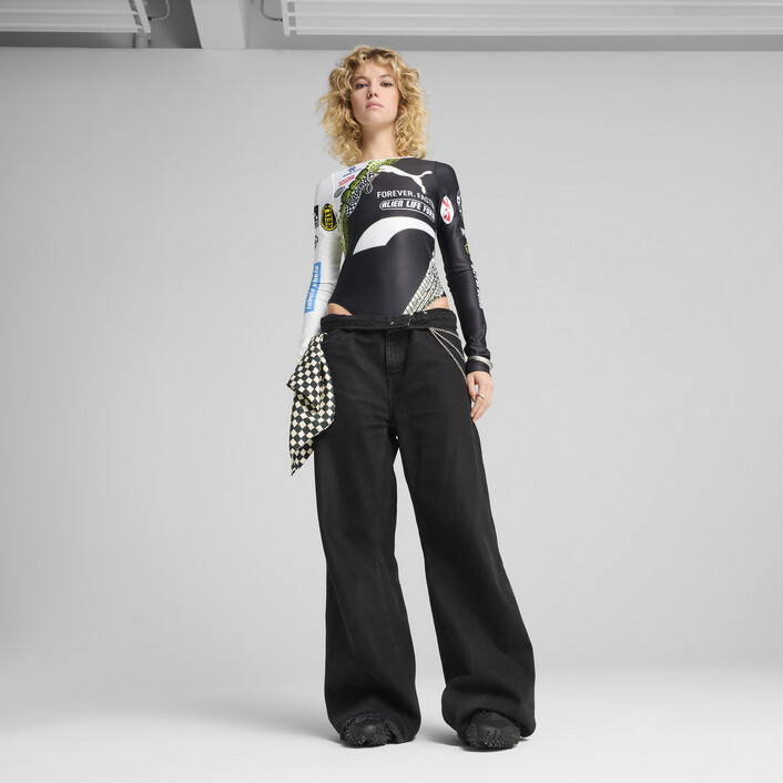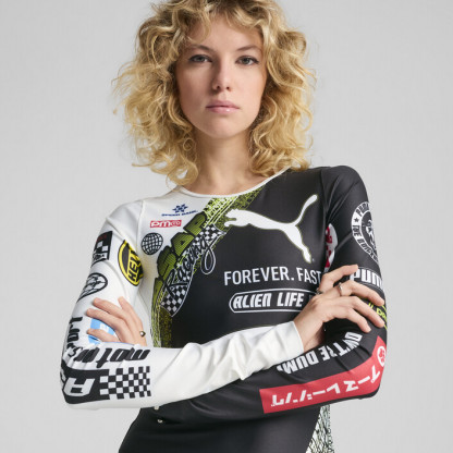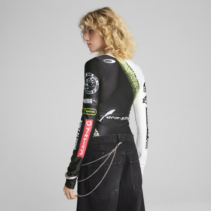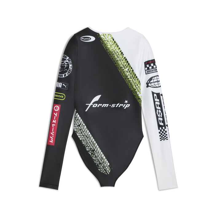 The ultimate fusion of streetwear and racing DNA – this long sleeve fitted body suit is perfect for a night out under the neon lights. Features custom sublimated A$AP Rocky and PUMthtA graphics, and a snap closure.
