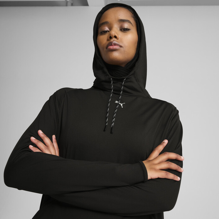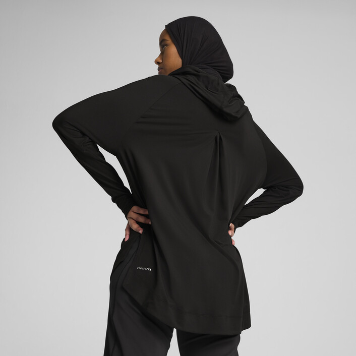 Step up your game with this MODEST hoodie. Featuring an elongated length for maximum coverage, a single front pocket for your valuables, and a feminine back cut line. Stay dry and comfortable with dryCELL technology. Ready for anything!
