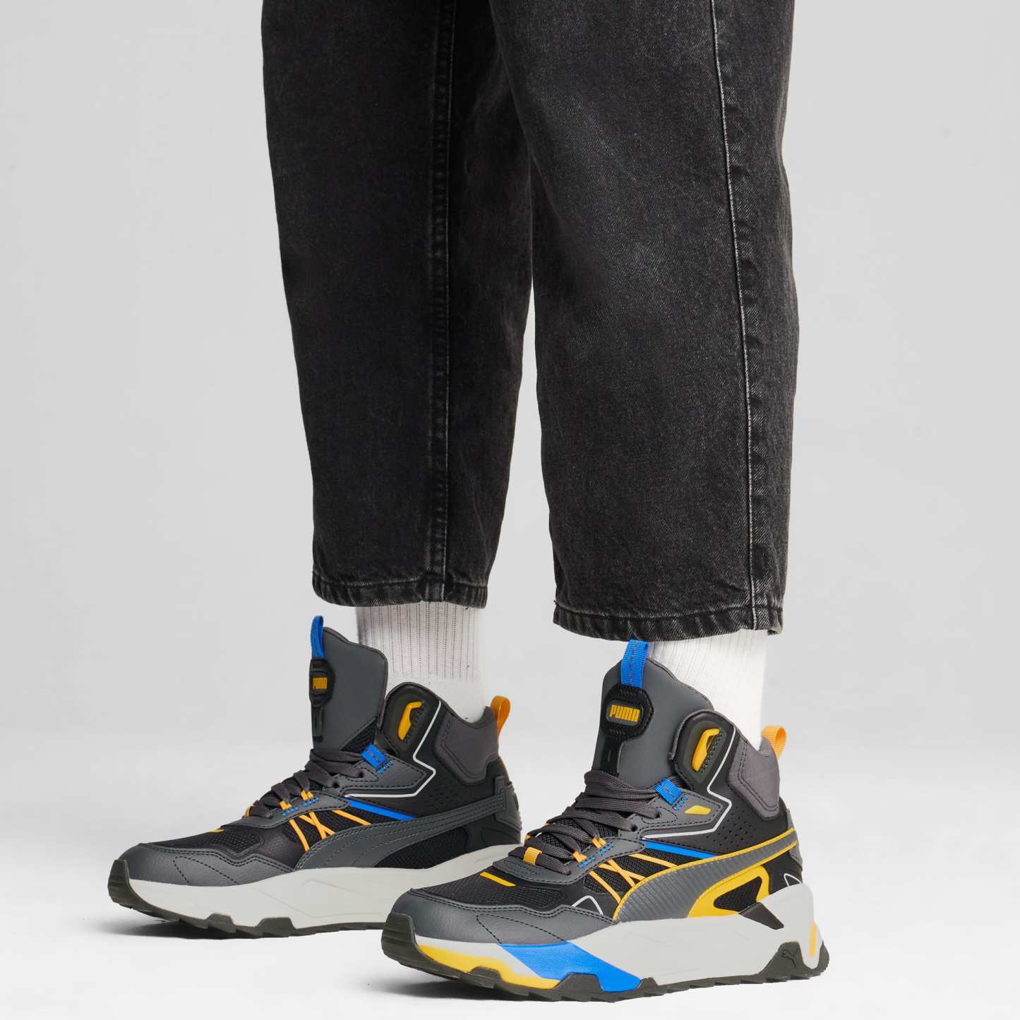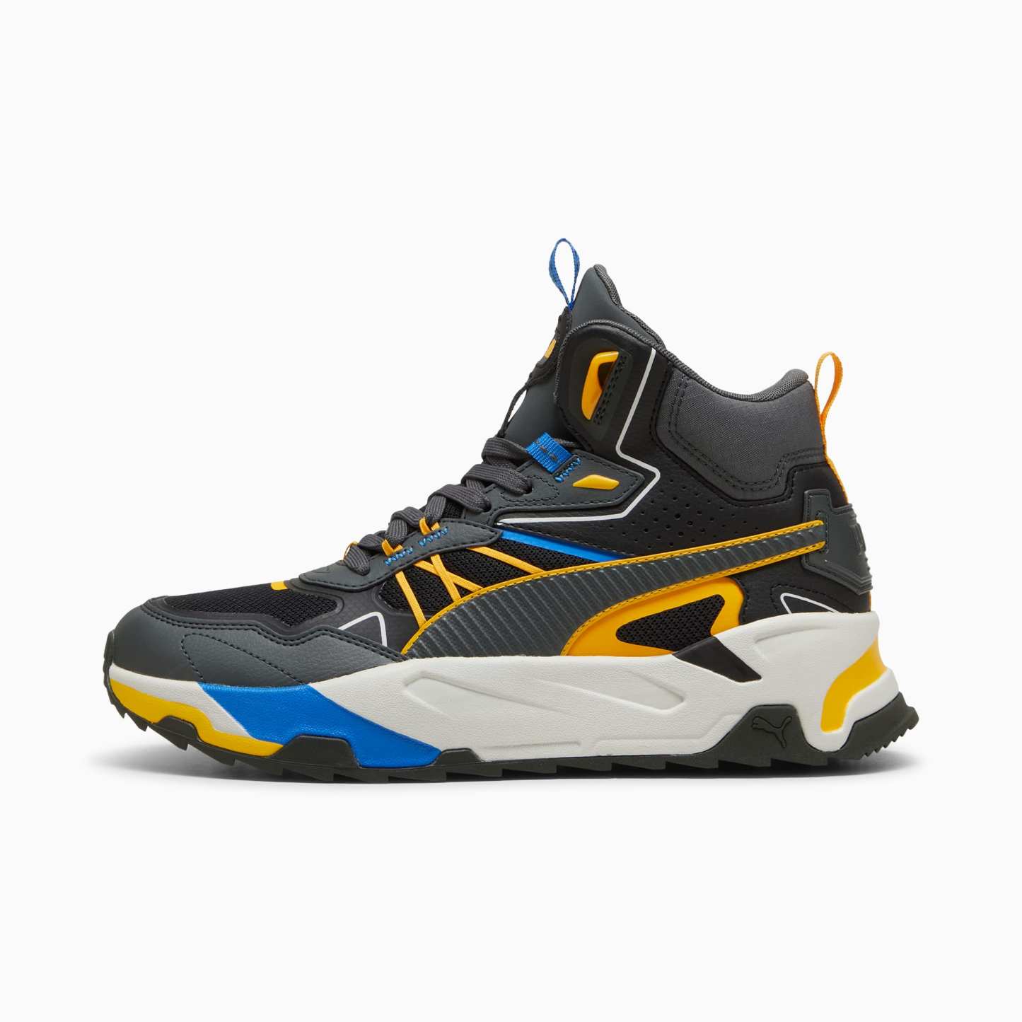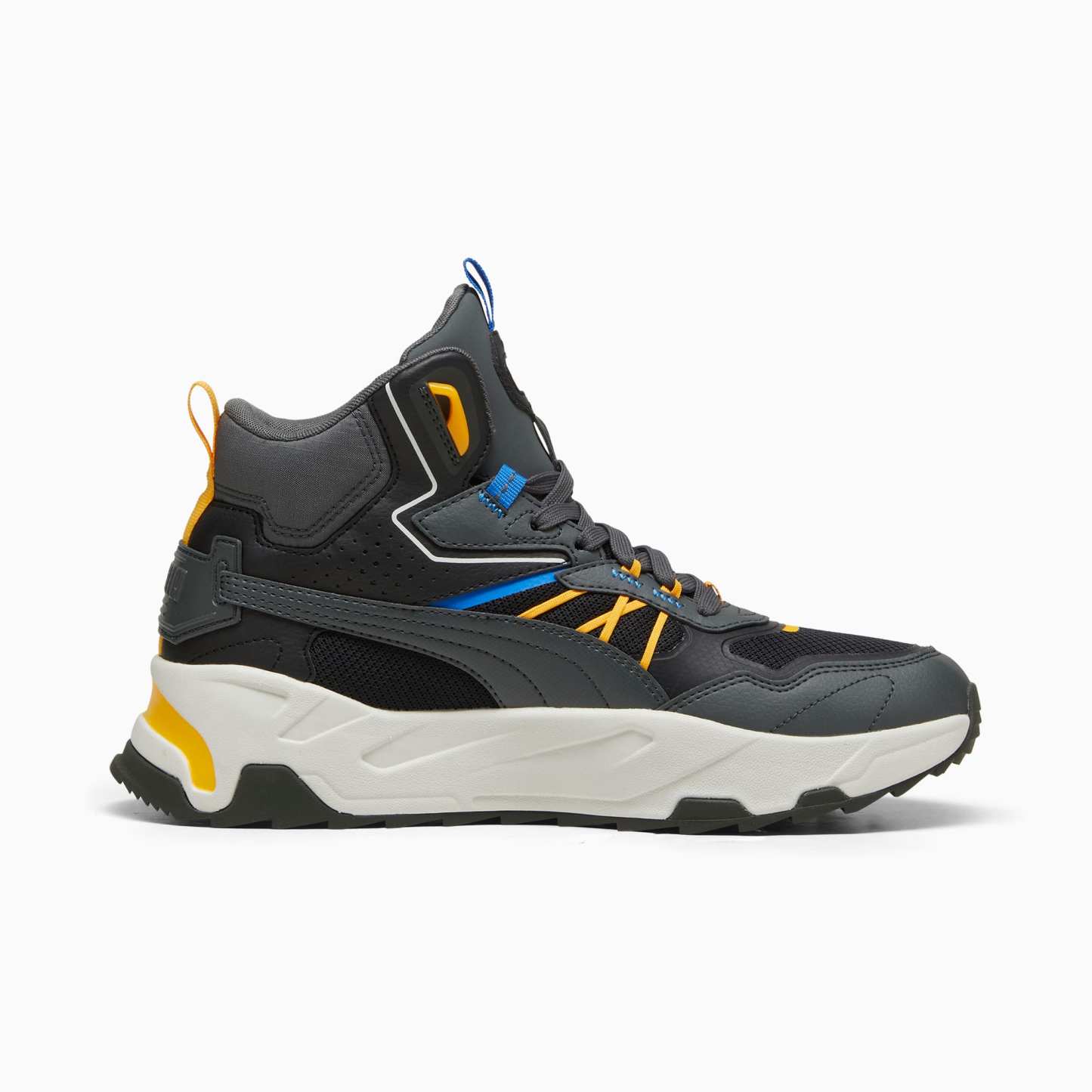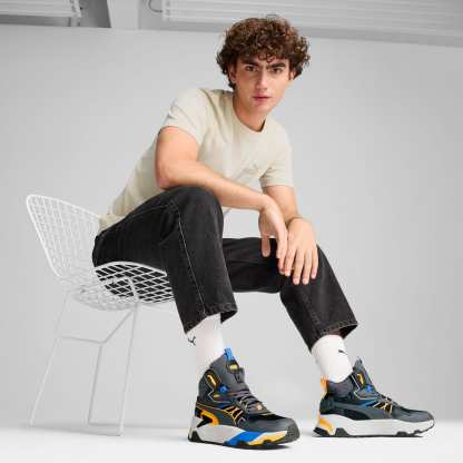 Introducing the Trinity Mid Hybrid, a mid-boot sneaker inspired by adventures in the great outdoors. The mixed material upper layers mesh, nylons, nubuck and synthetics, with webbing and stitching elements linking back to the hiking trends of the moment.